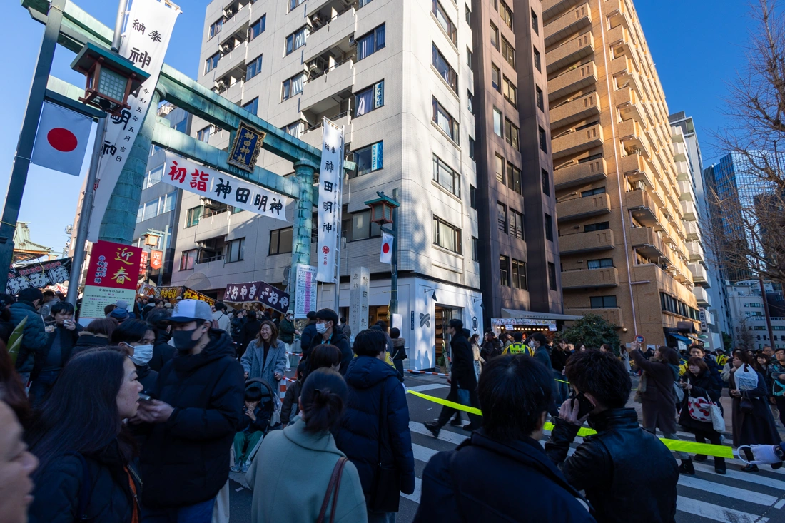 どうやら神田明神の参拝列が、道路の坂を下って信号を曲がってここまで伸びていた。